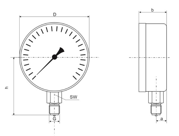 Jednoduchý tlakoměr s bourdonovou trubicí pro běžné požadavky na přesnost a konstrukci. Lze je použít ve všech aplikacích, kde kapalná nebo plynná média nejsou vysoce viskózní a nenapadají slitiny mědi ani nekrystalizují.